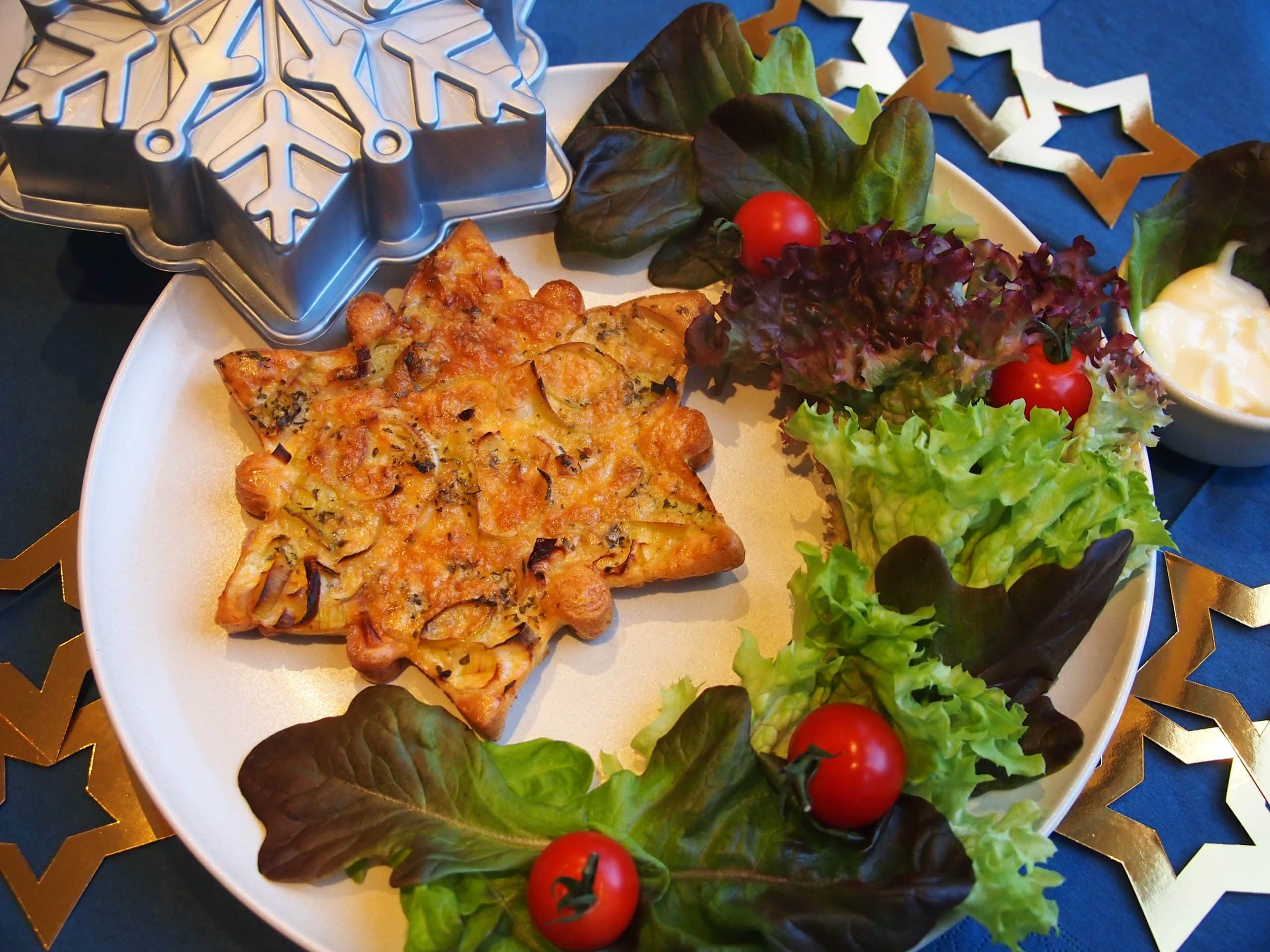 Koekenpan, mixkom, garde of handmixer, siliconen bakvorm met sterfiguur (Action), bord, klein schaaltje.