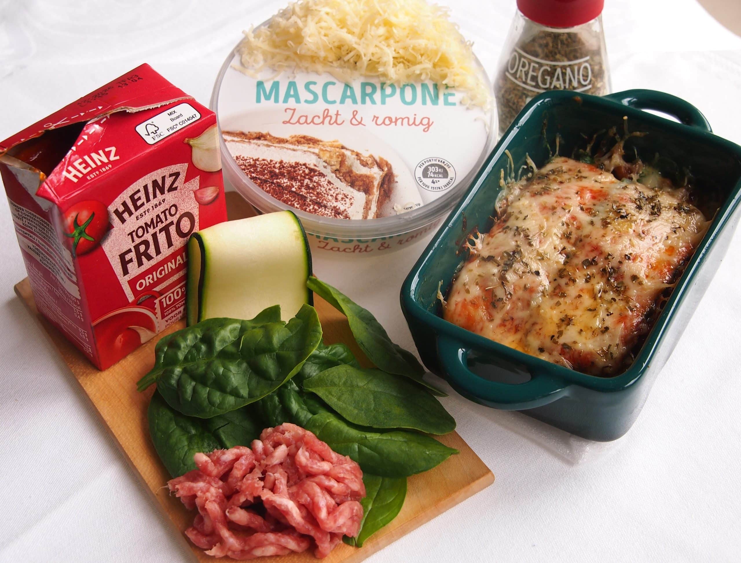 - verdeel de resterende hoeveelheid gehakt en spinazie over de courgette en dek af met de overige plakjes courgette.