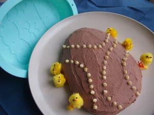 - versier het paasei met de witte chocolade druppels (of als alternatief geschaafde witte chocolade).