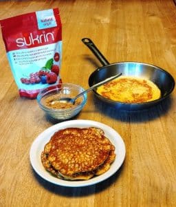 - serveer de pannenkoeken op een (warm) bord eventueel met poedersuiker van Sukrin® of Stevia®.